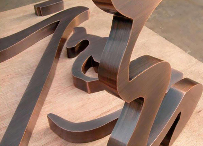 高級(jí)仿古銅字在我們的生活之中主要應(yīng)用于商家的店面LOGO,且它的呈現(xiàn)給人們的視覺表現(xiàn)藝術(shù)沖擊力是非常強(qiáng)的,仿古銅字制作工藝首先視其尺寸大小而定,較小的可用澆膠、曬版、烘黃工藝,其工藝精度高、難度大,可做的紋樣細(xì)如毫發(fā)。