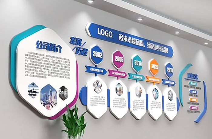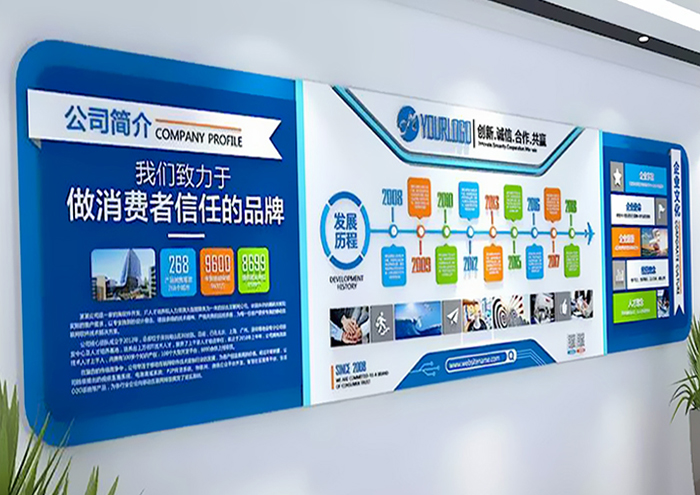 企業文化展示墻是文化墻建設工程的重要組成部分,它是企業文化的直觀展現形式,通過簡短的語言文字,濃縮一個公司或企業的核心價值觀,經營理念和發展規劃及遠景目標。